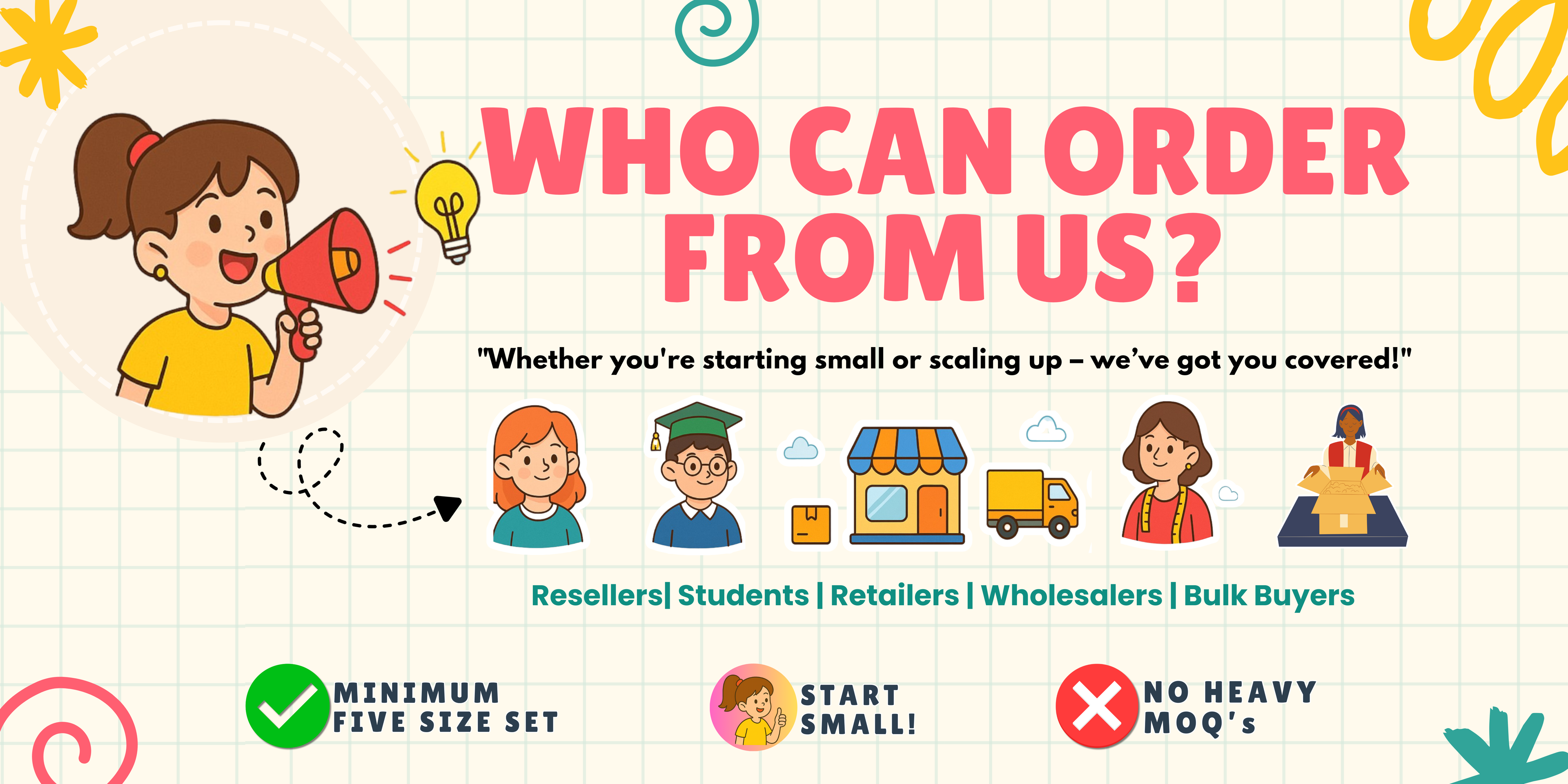 👉 Our MOQ is just 5 size set. You may choose different styles across categories.